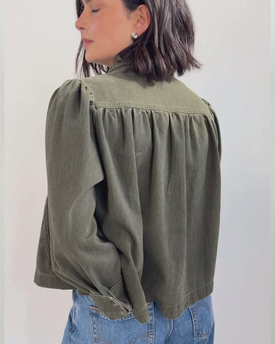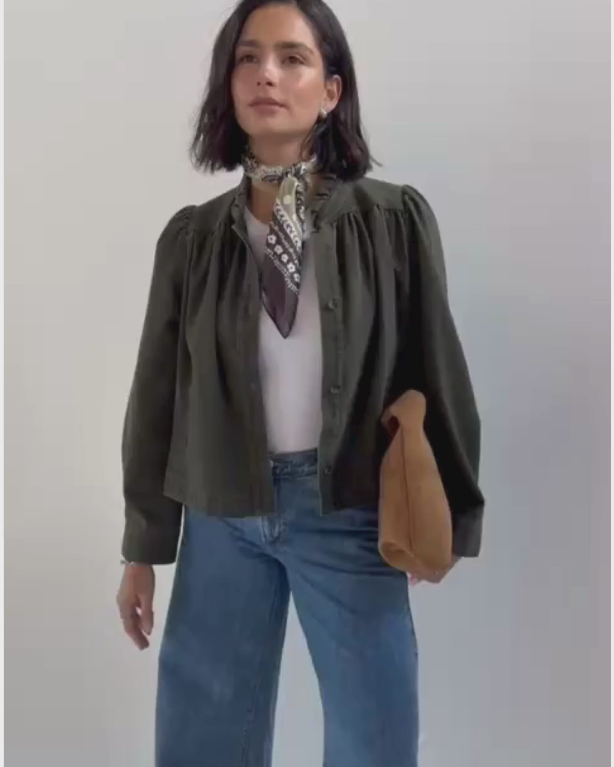 Relaxed yet refined, this slightly cropped jacket is made from 100% cotton in a rich khaki hue. Soft shoulder pleats create a beautifully shaped sleeve with subtle volume, balancing structure with ease.